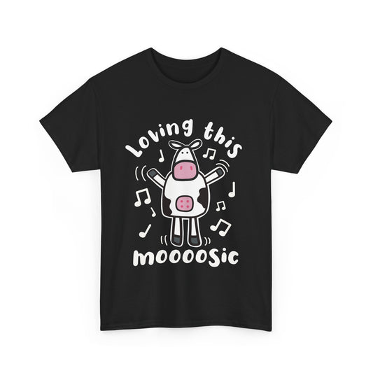 Funny Cartoon Cow T-Shirt 'Loving This Moooosic' Cow & Music Lover Tee, Festival & Concert Outfit, Cute Animal Pun Gift UK
